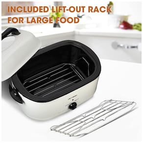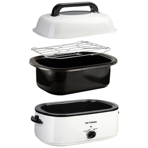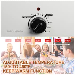Panela elétrica com capacidade de 22 litros, controle de temperatura ajustável, função de aquecimento, alça de toque frio, pote e tampa removíveis para fácil limpeza.Lâmpada piloto