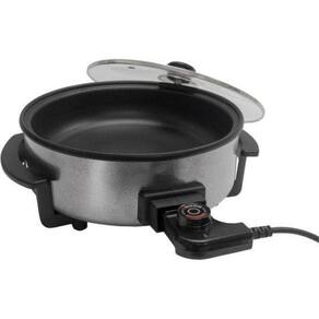 Panela elétrica com dupla camada antiaderente, tampa de vidro, cabo removível, controle de temperatura ajustável e fusível térmico de segurança.Lâmpada piloto