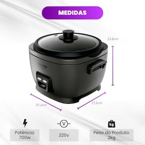 Principais Benefícios: - Capacidade para 10 xícaras (4 litros) – ideal para toda a família ou para quem gosta de adiantar refeições - Potente e rápida – 700W que garantem arroz soltinho em menos tempo - Tampa de vidro com saída de vapor – acompanhe o preparo sem abrir - Cuba antiaderente removível – fácil de limpar, evita que os grãos grudem - Função "Manter Aquecido" – arroz quentinho até a hora de servir - Cozimento a vapor – preserve os nutrientes e prepare legumes com saúde - Cabo de energia removível – mais segurança e praticidade na hora de servir - Design moderno e resistente – visual elegante que combina com qualquer cozinha