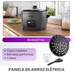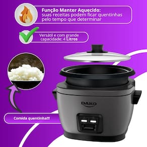 Especificações Técnicas: - Marca: Dako - Modelo: Panela Elétrica de Arroz 4L - Cor: Titanium - Capacidade: 10 xícaras / 4 litros** - Potência: 700W - Voltagem: 220V - Funções: Cozinhar, manter aquecido, desligamento automático - Material da cuba: Antiaderente - Tampa: Vidro com saída de vapor - Comprimento do cabo: 80 cm (removível) - Dimensões: 31,2 x 23,8 x 27,6 cm (L x A x P) - Peso aproximado: 2,2 kg - Garantia: 12 meses - Padrão da tomada: 10A - Produto importado - EAN: 7897180599690
