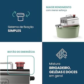 Panela Elétrica Automática Misturador de Brigadeiro 10 Litros Bivolt And Anodilar Cor: Verde O Misturador Elétrico de 10 Litros And é o equipamento ideal para a preparação de doces como brigadeiros, beijinhos, goiabadas, polentas, cremes e muitos outros docinhos e massas quentes. Esta panela automática, ou misturela, é ideal também para o preparo de massas salgadas em geral Prepare churros, coxinha, risoles, croquete, quibe, empada, pastel, pizza, pão e muitos outros salgados. Pás produzidas com Aço Inox eletropolidos, que são os materiais permitidos no ramo alimentício, o silicone presente nas pás é industrial e indicado para altas temperaturas. O produto possui certificação do INMETRO, conferindo qualidade extrema e segurança ao usuário. Além da certificação, esta panela misturadeira conta com um sistema de regulagem de velocidade preciso conferindo ótima qualidade, eficiência e rendimento com menos esforço de preparação dos doces e massas da sua produção. O regulador de velocidades da Panela Elétrica Misturador de Brigadeiro,conta com um sistema de regulagem de velocidade com um botão potenciometro giratório, sendo possível aumentar e diminuir a velocidade da misturadora de forma precisa de acordo com a sua necessidade de preparação. Características: - Ideal para - Fácil de Fixar - 10 Litros de Capacidade - Regulador de velocidade digital super preciso e prático - Pás de silicone e aço inox - Panela em alumínio - Carenagem em aço inox - Durável e fácil de limpar. - Prática e funcional - Cozimento rápido e uniforme - Potência do Motor: 65W - Peso total: 6,3Kgs - Voltagem: Bivolt, funciona tanto em 110v como em 220v. - Frequência: 50/60 Hz - Consumo: 0,5kw/h - Velocidade máxima do produto: 54 rpm - Acompanha pá para doces brigadeiro, geleias e doces em geral . Dimensões: - Comprimento: 39cm - Largura: 32cm - Altura: 30cm - Profundidade: 15cm - Peso: 6,3kgs Itens inclusos: - 01 Panela de Alumínio com acabamento pintado - 01 Misturadeira de Inox com regulador de velocidade integrado - 01 Manual de instruções do usuário Informações Importantes: Comprando conosco, sua compra será enviada muito bem protegida, além de possuir . Toda compra é enviada o mais rápido possível, no prazo máximo de 1 dia útil. Nós da Dalia Varejo temos compromisso com a rapidez