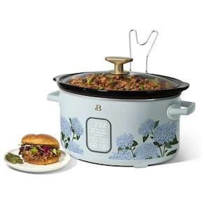 Panela elétrica Slow Cooker digital programável de 5,7 litros da linha Beautiful, com acabamento Hydrangea Floral, projetada para cozimento lento de porções familiares com controle eletrônico de tempo e aquecimento. A cuba interna em cerâmica e a tampa de vidro temperado proporcionam distribuição uniforme de calor, enquanto o painel com comando por toque permite selecionar funções e ajustes de forma prática.