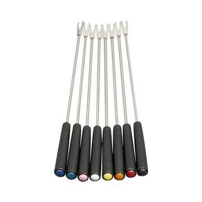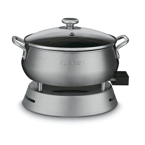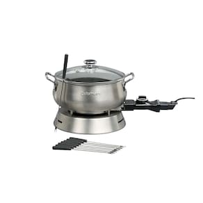 Panela elétrica para fondue em aço inox escovado com tampa de vidro temperado. Possui revestimento interno antiaderente, termostato com 8 níveis de ajuste de temperatura (44°C a 180°C) e sistema de aquecimento encapsulado para distribuição uniforme de calor. Inclui 8 garfos com identificadores coloridos e aro de suporte.Porta fio