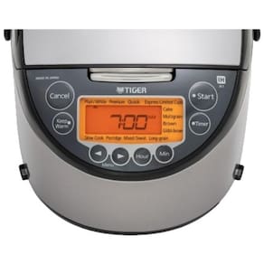 Panela elétrica de arroz com capacidade de 1,3L, potência de 400W, tecnologia de aquecimento por indução, 12 configurações de menu predefinidas, função de cozimento programável com timer de 24 horas e modo automático para manter aquecido.Lâmpada piloto