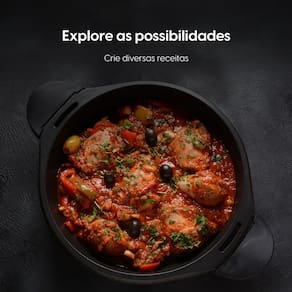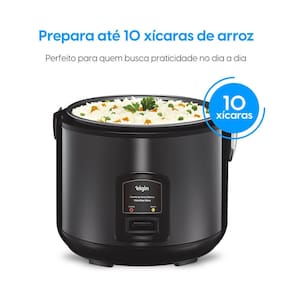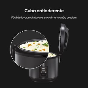 Com design moderno em aço inox escovado e cuba antiaderente, oferece durabilidade e fácil limpeza. A função 2 em 1 permite cozinhar arroz e preparar alimentos no vapor com a bandeja inclusa.