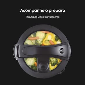 Após o preparo, a função Manter Aquecido é ativada automaticamente, garantindo que o arroz fique sempre na temperatura ideal. Seu grande diferencial é a tampa com visor transparente, permitindo acompanhar o preparo sem abrir a panela.