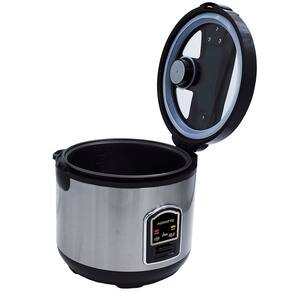 Panela elétrica multifuncional com sistema de cozimento a vapor, funções de cozinhar, aquecer e manter aquecido. Possui dispenser para legumes, tampa com visor de vidro, trava de segurança, interruptor de segurança e válvula de saída de vapor. Inclui lâmpada com indicação de funcionamento e cabo de energia removível.Lâmpada piloto