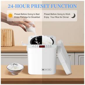 A Panela de Arroz Mini WHITE TIGER é uma solução inteligente para suas refeições. Com timer de 24 horas e função de manter aquecido, você pode programar o preparo do café da manhã e do jantar com antecedência, economizando tempo. Seu tamanho compacto permite cozinhar até 4 copos de arroz cru, rendendo até 46 copos de arroz, ideal para até 13 pessoas. Perfeita para dormitórios, escritórios, acampamentos e viagens. O painel de controle no topo torna a operação mais amigável, com indicadores LED para fácil acompanhamento. A panela interna antiaderente removível é segura para lava-louças e fácil de limpar, garantindo refeições saudáveis. Além disso, com essa panela multifuncional, você pode preparar arroz, sopas, mingau, bolos, iogurtes, massas e sobremesas com facilidade.