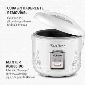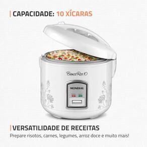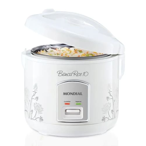 Com a Panela de Arroz Bianca Rice 10 Mondial você prepara seu almoço de forma mais prática. Possui capacidade para preparar até 10 xícaras de arroz e acompanha cesto que cozinha alimentos no vapor, preservando todos os nutrientes. Possui cuba removível com revestimento antiaderente e função aquecer, que deixa suas receitas sempre quentinhas. Acompanha colher e copo medidor.
