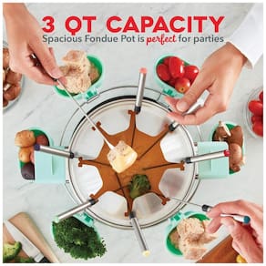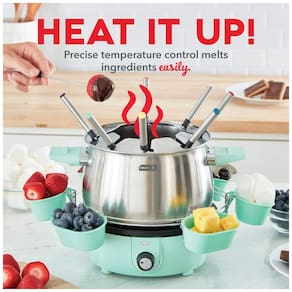 VERSITILIDADE Conjunto de fondue elétrico adequado para chocolate, queijo, caldo ou óleo. Sirva uma fondue de maneira fácil e deliciosa com o Dash Deluxe POTENCIÔMETRO ANTI COLANTE, INOXIDÁVEL, REMOVÍVEL Tigela removível de 3 quartos elegante em aço inoxidável escovado com interior antiaderente O revestimento antiaderente e sem PFOA facilita a limpeza. CONTROLE DE TEMPERATURA O controle preciso de temperatura permite que você aqueça uma variedade de ingredientes de fondue em apenas alguns minutos. DIMENSÕES 37 x x . INCLUI Fabricante de fondue dash deluxe, 8 garfos para fondue com código de cores, Garfo Rack para reduzir gotejamentos, Anel de Metal e Copos Guia de Receitas de Bom Gosto. SUPORTE BASEADO nos EUA Projetado em Nova York, com suporte ao cliente baseado nos EUA para todos os produtos Marca: Não Informado
