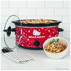 Transforme suas refeições com a encantadora panela elétrica de cozimento lento Hello Kitty! Com capacidade de 4,7 litros, essa panela é ideal para preparar pratos saborosos e ainda adiciona um toque adorável à sua cozinha. Sua estampa fofa, com itens de cozinha, gravatas-borboleta vermelhas e letras brancas, garante que você sorria cada vez que a usar.