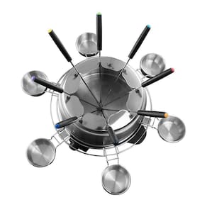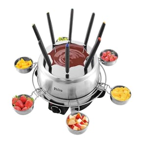 O que vem na caixa:1 Base para Panela com Seletor de Temperaturan1 Suporte para 6 potesn6 Potes em aço inox para molhos, frutas, pães e outros (70ml cada)n1 Panela em aço inox (2,35L total)n1 Aro de apoio para garfosn8 Garfos