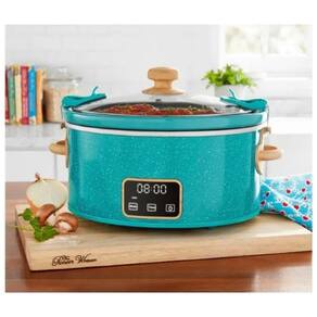 A panela elétrica slow cooker Pioneer Woman 6 litros com tampa travável foi projetada para preparo lento de refeições completas, mantendo temperatura constante ao longo de várias horas. O painel digital com controle por toque permite programar tempo e selecionar ajustes de aquecimento, facilitando o uso em rotinas domésticas com preparo antecipado.