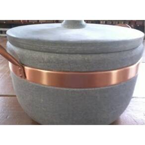 Medidas Número 5 (5 litros aproximadamente) MaterialPedra sabãoAlças em cobre Observação:* A panela precisa ser curada, processo este que é feito apenas uma vez, juntamente com a mercadoria irá um folheto explicativo. * Todo material em pedra sabão-após curado muda de cor ficando com uma tonalidade mais escura.* Fotos ilustrativas. Por ser artesanal as peças podem ter variações
