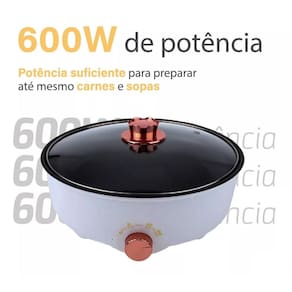 Panela elétrica multiuso com revestimento antiaderente, tampa de vidro, diâmetro interno de 26 cm e potência de 600W.Termostato regulável
