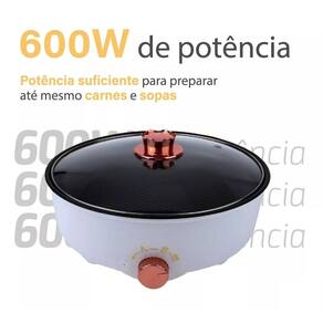Panela elétrica multiuso com revestimento antiaderente, tampa de vidro, diâmetro interno de 26 cm e potência de 600W.