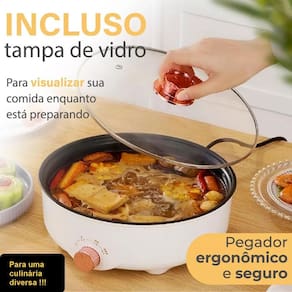 Panela elétrica multiuso com revestimento antiaderente, tampa de vidro, diâmetro interno de 26 cm e potência de 600W.