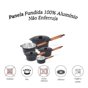 Panela Fundida Alumínio Batido 5 Peças Cabo de Madeira Tampa Fundida são duráveis e eficientes, apresentando alto desempenho no preparo de suas receitas.