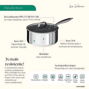 Panela inox 16cm antiaderente cerâmica tripla isa scherer Descrição do produto: Panela inox corpo triplo 16cm cerâmica isa scherer - mimo style A panela inox corpo triplo cerâmica com tampa 16cm da coleção isa scherer é a escolha perfeita para quem valoriza alta qualidade e eficiência na cozinha. Desenvolvida em parceria com a chef isa scherer, esta panela reúne design moderno e tecnologia avançada, proporcionando uma experiência culinária diferenciada e prática. Destaques do produto: - revestimento interno cerâmico antiaderente ppg fusionr hr: livre de ptfe e pfas, seu formato de colmeia facilita a limpeza, oferecendo resistência superior a riscos de utensílios de cozinha. - corpo triplo em aço inox: garante distribuição uniforme do calor, acelerando o cozimento e mantendo os alimentos aquecidos por mais tempo. - compatível com todos os fogões: funciona em fogões a gás, elétricos e de indução, além de poder ser levada ao forno, oferecendo praticidade e versatilidade para preparar e servir. Especificações técnicas: - diâmetro: 16 cm - altura: 8 cm - capacidade: 1,5 litros - material: aço inox corpo triplo com revestimento cerâmico em colmeia Benefícios adicionais: - assinatura isa scherer: inspirada pela chef e vencedora do masterchef 2021, esta linha de utensílios oferece sofisticação e praticidade para sua cozinha. - tecnologia antirrisco: a micromalha em aço inox protege o antiaderente, tornando a panela resistente a arranhões e fácil de limpar, ideal para o uso diário. 1. Posso usar a panela no forno Sim, ela é compatível com uso no forno, ampliando suas possibilidades de preparo. 2. O revestimento é seguro Sim, o revestimento cerâmico é livre de ptfe e pfas, sendo uma escolha segura e ecologicamente correta. 3. Funciona em fogão de indução Sim, a panela é compatível com todos os tipos de fogão, incluindo indução. 4. O produto tem Sim, nossos produtos possuem . O período de varia de acordo com o fabricante e o tipo de produto. Consulte a descrição do produto para mais informações. 5. O produto é novo ou 6. Posso rastrear meu pedido Sim, após a confirmação da compra,a própria plataforma fornecerá todos os dados de rastreamento para acompanhar a entrega do seu pedido. 7. Posso retirar o produto em algum lugar Atualmente, não oferecemos a opção de retirada em local físico. Todos os nossos produtos são entregues diretamente na sua casa. Transforme sua rotina culinária com a panela inox 16cm isa scherer e garanta mais qualidade e praticidade em cada receita Marca: Não Informado