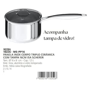 Panela inox 16cm antiaderente cerâmica tripla isa scherer Descrição do produto: Panela inox corpo triplo 16cm cerâmica isa scherer - mimo style A panela inox corpo triplo cerâmica com tampa 16cm da coleção isa scherer é a escolha perfeita para quem valoriza alta qualidade e eficiência na cozinha. Desenvolvida em parceria com a chef isa scherer, esta panela reúne design moderno e tecnologia avançada, proporcionando uma experiência culinária diferenciada e prática. Destaques do produto: - revestimento interno cerâmico antiaderente ppg fusionr hr: livre de ptfe e pfas, seu formato de colmeia facilita a limpeza, oferecendo resistência superior a riscos de utensílios de cozinha. - corpo triplo em aço inox: garante distribuição uniforme do calor, acelerando o cozimento e mantendo os alimentos aquecidos por mais tempo. - compatível com todos os fogões: funciona em fogões a gás, elétricos e de indução, além de poder ser levada ao forno, oferecendo praticidade e versatilidade para preparar e servir. Especificações técnicas: - diâmetro: 16 cm - altura: 8 cm - capacidade: 1,5 litros - material: aço inox corpo triplo com revestimento cerâmico em colmeia Benefícios adicionais: - assinatura isa scherer: inspirada pela chef e vencedora do masterchef 2021, esta linha de utensílios oferece sofisticação e praticidade para sua cozinha. - tecnologia antirrisco: a micromalha em aço inox protege o antiaderente, tornando a panela resistente a arranhões e fácil de limpar, ideal para o uso diário. 1. Posso usar a panela no forno Sim, ela é compatível com uso no forno, ampliando suas possibilidades de preparo. 2. O revestimento é seguro Sim, o revestimento cerâmico é livre de ptfe e pfas, sendo uma escolha segura e ecologicamente correta. 3. Funciona em fogão de indução Sim, a panela é compatível com todos os tipos de fogão, incluindo indução. 4. O produto tem Sim, nossos produtos possuem . O período de varia de acordo com o fabricante e o tipo de produto. Consulte a descrição do produto para mais informações. 5. O produto é novo ou 6. Posso rastrear meu pedido Sim, após a confirmação da compra,a própria plataforma fornecerá todos os dados de rastreamento para acompanhar a entrega do seu pedido. 7. Posso retirar o produto em algum lugar Atualmente, não oferecemos a opção de retirada em local físico. Todos os nossos produtos são entregues diretamente na sua casa. Transforme sua rotina culinária com a panela inox 16cm isa scherer e garanta mais qualidade e praticidade em cada receita Marca: Não Informado