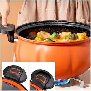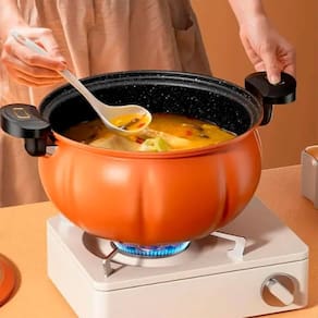 Design de abóbora, Cozimento otimizado por micro pressão, Tampa de vidro temperado, Revestimento antiaderente (se aplicável), Alças ergonômicas.Lâmpada piloto