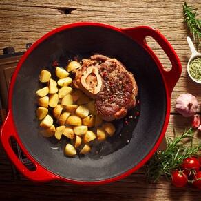 Panela Mineira Risoto Vermelha de Ferro Fundido TV 36cm 5L A Panela Risoto Vermelha Alça de Ferro da Panela Mineira é um produto moderno, prático e eficiente, que apresenta alto desempenho no preparo de diversas receitas. O calor distribuído por toda a superfície faz com que o alimento cozinhe de maneira uniforme, conservando suas propriedades e nutrientes. Possui um design elegante, com base oval e bordas alongadas, o que a torna excelente para grelhar, fritar, cozinhar e, principalmente, servir. Ideal para risotos, peixadas, carnes, ensopados e muito mais. Onde usar: Pode ser utilizada em fogões a gás, a lenha, elétricos, cooktops de indução, vitro-cerâmicos, fornos, grills, churrasqueiras e fogo de chão. Como é feito em ferro fundido, aconselha a utilizar luva térmica ou pano. Orientação de Uso e Conservação:Antes do primeiro uso: Lave com água e sabão, seque bem com um pano e leve ao fogo para remover toda a umidade. Já vem pronta para uso, então não precisa ser curada. Guarde em um local seco. Após cada uso: Lave com água e sabão, usando uma esponja ou escova para remover todos os resíduos de alimentos. Se restarem resíduos, ferva água com um pouco de detergente para soltá-los. Pintura: Revestimento atóxico que garante durabilidade e proteção prolongada, sem causar nenhum dano à saúde. Pode ser utilizada no forno, porém, é importante ressaltar que a exposição ao calor elevado pode danificar a pintura, causando manchas ou queimaduras na superfície externa. Características Técnicas e Medidas:Altura com Tampa: 16,5cm.Tampa: Vidro Temperado.Altura sem Tampa: 8cm.Material: Ferro Fundido.Alças: Alça de Ferro.Modelo: Redondo.Diâmetro: 36cm.Peso: 6,95Kg.Litragem: 5L.Linha: CHEF. Itens Inclusos:01 Panela Risoto Vermelha e Alça Panela Mineira 36x8cm 5L.01 Tampa de Vidro Temperado 36cm.01 Batoque em Platinela. Código: 4548PMProdutoLojaPlast.