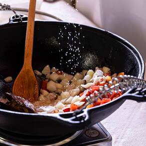 A Panela Wok Alça Espiral da Panela Mineira possui um design autêntico, com o interior abaulado e bordas arredondadas que evitam que o alimento transborde da panela. Ideal para preparar peixes, carnes, feijoadas, frutos do mar, legumes e outros pratos, de maneira prática e eficiente. Sua excelente distribuição e retenção de calor, característico do ferro fundido, mantém os alimentos aquecidos por muito mais tempo, além de enaltecer seus sabores e aromas.