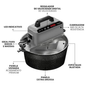 Regulador de velocidade digital com até 30 níveis, motor de 130 W com sistema RED-Plus de proteção, panela em alumínio fundido com fundo triplo e paredes reforçadas, estrutura externa em ABS, espátulas de silicone próprias para uso culinário, temporizador digital e suporte para virar doces e massas.Lâmpada piloto