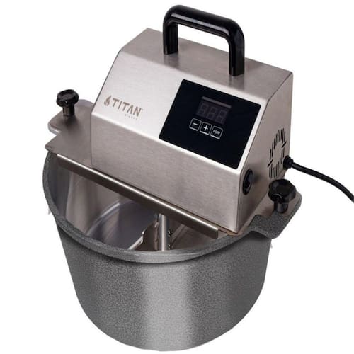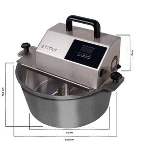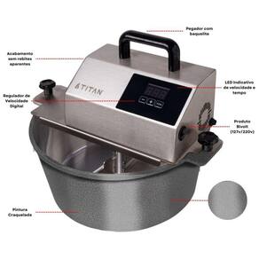 Panela misturadora de doces com capacidade de 10 litros, ideal para médias produções. Possui mistura automática, estrutura robusta, aquecimento uniforme, fácil de limpar e usar, economiza tempo e esforço, e design compacto. Conta com controlador digital para ajustar tempo e velocidade com precisão.Bowl de congelamento