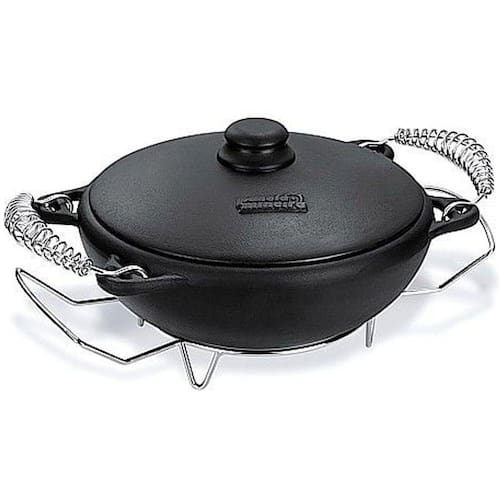 Panela Moqueca de ferro fundido. Medida: 27 cm de diâmetro, 3,5 litros de capacidade. Esta moquequeira tem forma arredondada do fundo e de suas bordas. ACOMPANHA TAMPA DE FERRO COM PUXADOR EM BAQUELITE, acompanha também suporte aparador em aço cromado para servir à mesa. Possui alças em aço espiral que não esquentam e dão requinte e modernidade a panela. A moquequeira de ferro apresenta inúmeras vantagens com relação aos modelos similares feitas em pedra ou barro, entre as principais vantagens estão a durabilidade (não lascam, não trincam e não quebram), condução e conservação de calor. Pode ser utilizada em todos os tipos de fogão a gás, a lenha, elétrico e também em cooktop de indução. Apesar de ser uma panela de moqueca ela não se limita a preparar somente esse prato, muito versátil e boa para preparar carnes, feijoada, ensopados, peixada, bacalhoada.