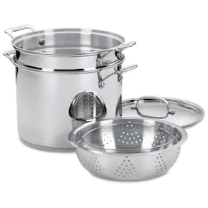 O conjunto inclui um acessório profundo para massa, que permite retirar e escorrer a massa cozida diretamente da panela sem necessidade de uma peneira adicional. Além disso, uma cesta para cozimento a vapor posicionada sobre a panela facilita o preparo de alimentos como brócolis, camarão e legumes, garantindo uma culinária saudável e sem gordura.