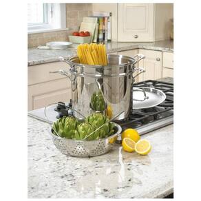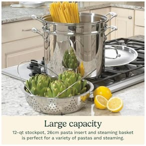 É ideal para cozinhar e escorrer massas em tamanho familiar, com capacidade para 11,20 litros. Feita de aço inoxidável 18/10 de qualidade profissional, a panela não reage com alimentos ácidos e possui um acabamento espelhado que mantém seu brilho mesmo após uso frequente na máquina de lavar louça, freezer, grelha e forno, suportando até 287ºC.