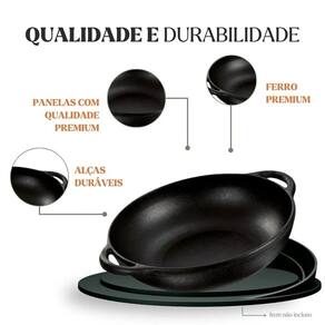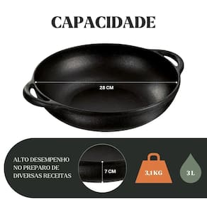 Modelo: Panela Parmegiana 28x7cm Material: Ferro fundido Medidas: 28 × 7 cm (Diâmetro × Altura) Capacidade: 3 L Peso: 3,1 kg Diferenciais: Alça de ferro resistente