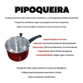 Especificações técnicas: Material: alumínio fundido de alta qualidade Dimensões: 20 cm de diâmetro, 15 cm de altura Capacidade: até 4.5 litros de pipoca Compatibilidade: fogão a gás e elétrico.