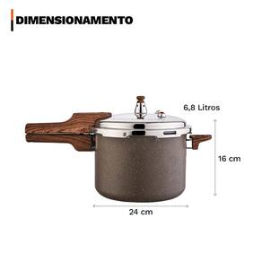 Distribuído por feheros shop Panela antiaderente 6,8 litros revestimento cerâmico indução premium Atenção A panela com revestimento cerâmico possui propriedades antiaderentes que ajudam a evitar que os alimentos grudem. Porém, não é 100% antiaderente e pode exigir pequena quantidade de óleo ou para melhor desempenho. O revestimento cerâmico é uma alternativa saudável e ecológica, pois não libera substâncias tóxicas quando aquecido. - produto certificado pelo inmetro nível a . - evite que a chama do fogão atinja as laterais da panela. - não deixe o produto superaquecer vazio. - leia atentamente a descrição e siga o passo a passo que o fabricante recomenda. Informações do produto A panela 6,8 litros é ideal para famílias grandes ou para quem gosta de preparar receitas em maior quantidade. Compatível com fogões a gás, elétricos, vitrocerâmicos e por indução, ela garante versatilidade para qualquer cozinha. Sua estrutura em alumínio de alta qualidade, combinada ao revestimento cerâmico antiaderente em múltiplas camadas, proporciona resistência e longa durabilidade, evitando que os alimentos grudem e permitindo o uso de menos óleo, tornando as refeições mais saudáveis. Especificações técnicas - compatível com fogões a gás, elétricos, vitrocerâmicos e por indução, oferecendo versatilidade para diferentes cozinhas. - revestimento cerâmico antiaderente livre de pfoa, que preserva o sabor dos alimentos e permite cozinhar com menos óleo. - cabo de baquelite com revestimento soft touch macio, que não esquenta e garante conforto e segurança. - estrutura em alumínio de alta resistência, com duas camadas de revestimento cerâmico e uma camada especial resistente a altas temperaturas, garantindo durabilidade e desempenho superior. - sistema de segurança completo com regulador , duas válvulas de segurança adicionais, válvula flutuante, anel de vedação e tampa à prova de bloqueio. Ficha técnica do produto - altura com tampa: 20 cm - altura sem tampa: 16 cm - capacidade: 6,8 l - compatibilidade: fogões de indução, a gás, elétricos e vitrocerâmicos - comprimento total: 47 cm - certificação: inmetro nível a - diâmetro: 24 cm - dispositivos de segurança: 6 sistemas de bloqueio - espessura: 4 mm - material do cabo: baquelite soft touch - material do corpo: alumínio de alta qualidade - peso: 2,200 kg - revestimento: cerâmico Antes do primeiro uso - lave a panela com esponja macia e detergente líquido. - seque bem com pano limpo. - coloque uma fina camada de óleo vegetal na borda do corpo e no anel de vedação. - coloque água até a metade da panela, feche a tampa e aqueça até que o regulador libere o vapor. - leve ao fogo baixo por 2 minutos. - deixe esfriar, lave novamente e seque antes de usar. Após o uso - aguarde a panela esfriar antes de lavar. - lave manualmente com água morna, sabão neutro e esponja macia. - para remover resíduos, deixe de molho em água por alguns minutos. - não utilize esponjas ou produtos abrasivos. - nunca segure o regulador para liberar a pressão e jamais force a abertura da tampa, pois ela só se abrirá quando a pressão estiver totalmente liberada. - não é indicado o uso em lava-louças, para preservar o revestimento cerâmico e garantir maior durabilidade. Item incluso no pacote - 01 panela antiaderente revestimento cerâmico 6,8 litros Todas as fotos são reais dos produtos. Qualquer dúvida, estamos à disposição. Dúvidas frequentes 01- o produto é novo Possui R: sim, o produto é novo e possui de 3 meses conforme as normas do fabricante. 02- é compatível com fogão de indução R: sim, ele possui fundo especial que permite o uso em fogões de indução, além de fogões a gás, elétricos e vitrocerâmicos.
