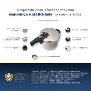 Especificações: Cor: Inox Linha: Galaxy Tipo: Panela de Pressão Capacidade: 6 Litros Material do Corpo: Aço Inoxidável Material da Tampa: Aço Inoxidável Cabos/Alças: Baquelite Base: Compatível com Indução, Funciona em todos os tipos de fogão Segurança: 7 Dispositivos de Segurança Recursos de Segurança: Regulador de Pressão Válvula: Válvula de pressão e trava na alça. Dimensões do Produto: 26 x 24 x 42 cm (AxLxC) Dimensões da Embalagem: 27 x 27 x 44 cm (AxLxC)