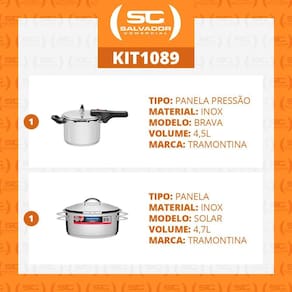 Componentes do kit:- 01 panela com fundo triplo em aço inox 20 cm 4,5 l - brava - tramontina cód. 62416200- 01 panela aço inox com fundo triplo solar pit 1 cód. 65510830 solardescrição e caracteristica da ficha técnica:panela com fundo triplo em aço inox 20 cm 4,5 l - brava - tramontina cód. 62416200- produzida em aço inox- pode ser utilizada em fogão a gás, elétrico, vitrocerâmico ou por indução- cabo e alça antitérmicos- fundo triplo: aço inox, alumínio, aço inox- 5 dispositivos de segurança- capacidade mínima: 250ml de líquido 1/4 litro - capacidade máxima: 2/3 da capacidade total da panela alimento + líquido - capacidade da panela: 4.5 litros- pressão de trabalho: 80kpa- peso líquido: 2,34 kg- peso bruto: 2,64 kg- medidas do produto: 21cm a x 22,7cm l x 42,7cm p- diâmetro da panela: 20cm- medidas da embalagem: 20,3cm a x 23,2cm l x 40,6cm p- de 1 ano contra defeito de fabricação.Panela aço inox com fundo triplo solar pit 1 cód. 65510830 solar- totalmente feitas em aço inox.- o fundo triplo aço inox + alumínio + aço inox .- podem ir ao forno para gratinar ou finalizar pratos, na temperatura máxima de 260c.- tampas com saída de vapor e encaixe perfeito.- podem ser utilizadas nos fogões: gás, elétrico, vitrocerâmico e indução.- : 25 anos 90 dias de legal, acrescidos de 24 anos e 09 meses de contratual para vícios ou defeitos de fabricação- pit 1 - 62503240 diâmetro - 24cm 4,7l espessura: 0,7mm ean: 7891116000960- peso bruto: 2,09 kg- medida embalagem: 13 cm alt x 35 cm l x 38 cm p. Marca: Não Informado