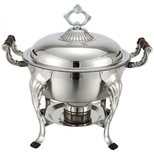 Construção em aço inoxidável 18, 8 com acabamento espelhado Capacidade de rodada de 6 litros Inclui panela de água, panela de comida, tampa de cúpula e 1 suporte de combustível com tampa Forma redonda elegante Detalhes em madeira para puxadores Marca: Não Informado