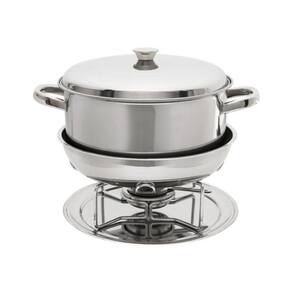 Acessórios inclusos: 01 Caçarola Funda com Tampa;01 Suporte Cromado;01 Fogareiro Aço Inox Grande com Abafador;01 Prato Ø 32 cm;01 Cuba para Banho Maria Ø 27 cm.