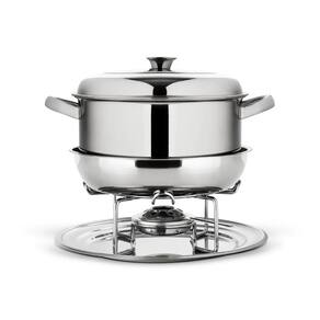 O Rechaud Plátanos tem Caçarola Funda e Tampa de Aço Inox, um material higiênico e neutro, ideal para ser utilizado em contato com os alimentos. Possui capacidade para 5,7 Litros e vem com um Suporte Cromado, um Fogareiro de Aço Inox Grande e com Abafador e uma Cuba para Banho Maria. Tudo isso sobre um Prato de Aço Inox com 32 centímetros de diâmetro. Um conjunto completo para servir a comida aquecida e com muita elegância.