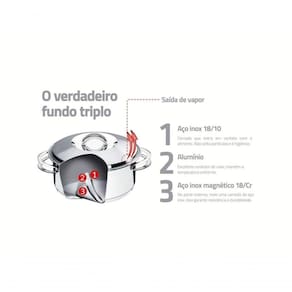 - O fundo triplo (aço inox + alumínio + aço inox) das panelas distribui o calor uniformemente, proporcionando um cozimento mais rápido e uniforme, economizando energia, deixando os alimentos macios, saborosos e aquecidos por mais tempo.- Totalmente feitas em aço inox, não soltam nenhum resíduo nos alimentos, mantendo-os saudáveis.- A tampa possui dois furos para saída de vapor, não permitindo a formação de vácuo.- As panelas podem ser utilizadas nos seguintes fogões: por indução, gás, elétrico e vitrocerâmico.- seu desenho limpo e sem cantos Torna a limpeza muito mais fácil.