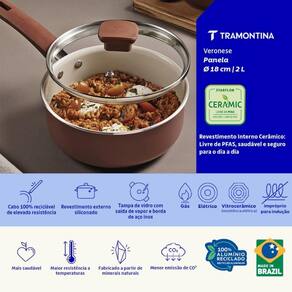 Com a panela Tramontina Veronese em alumínio reciclado com revestimento interno cerâmico e externo siliconado argila 18 centímetros 2 litros, o preparo diário das refeições fica mais leve e eficiente. A base em alumínio reciclado garante aquecimento uniforme, contribuindo para cozimento equilibrado. O revestimento cerâmico interno oferece praticidade durante o cozimento. Com design moderno e funcional, a peça se destaca pela versatilidade e facilidade de uso em diferentes receitas.