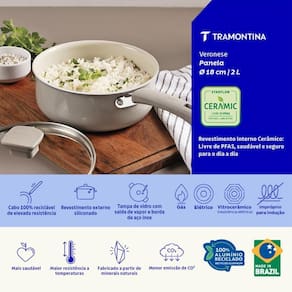 Com a panela Tramontina Veronese em alumínio reciclado com revestimento interno cerâmico e externo siliconado bege mineral 18 centímetros 2 litros, você tem uma peça leve e com desempenho adequado para o uso cotidiano. A estrutura em alumínio reciclado assegura aquecimento uniforme, favorecendo preparos mais eficientes. O revestimento cerâmico interno oferece praticidade durante o cozimento. O acabamento siliconado em bege mineral complementa o visual da panela, trazendo um estilo atual que se integra bem à cozinha.