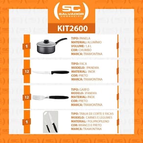 MUITO IMPORTANTE:CONFERIR PRODUTOS NO ATO DO RECEBIMENTO. NÃO ACEITAR PRODUTOS COM EMBALAGEM VIOLADA (AMASSADO, RASGADO, ABERTO, QUEBRADO, ETC), A RECUSA DEVE SER FEITA NO ATO Componentes do Kit:1 - Panela Turim Alumínio Antiaderente Chumbo 16cm 1,4L PTC3 - Tramontina12 - Faca para Churrasco Ipanema com Lâmina em Aço Inox 5 Pol Cabo Preto FPTOP - Tramontina12 - Garfo de Mesa Ipanema com Lâmina em Aço Inox Cabo Preto GPTOP - Tramontina1 - Kit Para Carnes e Legumes Plenus Lâminas Inox Cabos Preto e Tábua 3 Peças Panela Turim Alumínio Chumbo Antiaderente 1,4l + Cojunto Ipanema 24pc + Tábua e Facas - Tramontina Eleve sua experiência culinária com o Conjunto Tramontina, a escolha perfeita para quem busca praticidade e desempenho profissional. Projetado para cozinheiros domésticos e chefs, este kit multifuncional simplifica sua rotina na cozinha. A panela de alumínio antiaderente assegura que os alimentos não grudem, um fator crucial para preparos sem complicações. A tábua e as facas proporcionam cortes precisos, tornando cada receita uma tarefa mais fácil e agradável. O revestimento antiaderente da panela facilita a limpeza, enquanto o conjunto de 24 talheres Ipanema, em aço inox, oferece resistência à corrosão e beleza. Fabricado com materiais de alta qualidade, como o alumínio e o aço inox, este conjunto é construído para resistir ao uso diário. As facas com lâminas de aço inoxidável garantem um corte suave e eficiente. A versatilidade deste conjunto também ajuda a otimizar o espaço na sua cozinha. Não perca a chance de transformar a maneira como você cozinha. Adquira agora o Conjunto Tramontina e eleve o nível das suas refeições! Especificações Panela:- Capacidade: 1,4L;- Alumínio com 1,2mm de espessura;- Revestimento anti-aderente;- Altura com tampa e cabo: 13,9cm;- Altura somente com tampa: 14,4cm;- Diâmetro: 16cm;- Comprimento total: 31,9cm;- Não utilizar em temperaturas superiores à 260C. Especificações Faca Churrasco:- Para suas refeições diárias ficarem ainda melhor, você precisa contar com a Faca para Churrasco Tramontina Ipanema com Lâmina em Aço Inox e Cabo de Polipropileno Preto 5 polegadas.- Ideal para lhe acompanhar nas principais refeições do dia, ela é produzida com lâmina em aço inox, que garante mais resistência e durabilidade, além de proporcionar um corte perfeito.- Seu cabo na cor preta é feito em polipropileno e proporciona um manuseio muito mais confortável, além de ser muito sofisticado.- A faca ainda é muito fácil de limpar e pode ir à máquina de lavar louças.- Mais um item Tramontina pensado especialmente em você!- A lâmina de aço inox tem maior durabilidade do fio devido ao tratamento térmico.- O cabo de polipropileno possui maior resistência e durabilidade.- Pode ir à máquina de lavar louças facilitando seu dia a dia. Especificações Garfos:- O Garfo de Mesa Tramontina Ipanema com Lâmina em Aço Inox e Cabo de Polipropileno Preto é aquele talher que todo mundo ama, pois combina com todos os estilos de mesa.- Perfeito para uso diário, ele tem lâmina produzida em aço inox com espessura que fornece maior resistência e durabilidade.- Seu cabo é em polipropileno na elegante cor preta e proporciona um manuseio super confortável, além de garantir uma mesa muito mais estilosa.- É muito fácil de limpar e pode ir à máquina de lavar louças.- Um produto especial que sua casa merece!- A lâmina de aço inox garante maior resistência devido a espessura do aço e a estampagem da lâmina.- O cabo de polipropileno possui maior resistência e durabilidade.- Pode ir à máquina de lavar louças facilitando seu dia a dia. Especificações Kit Lâminas:- Linha: Plenus;- Composição do Kit: 1 faca para carnes com lâmina em aço inox, 1 faca para legumes com lâmina em aço inox, 1 tábua de corte em polipropileno na cor branca;- Material das Lâminas: Aço inoxidável com tratamento térmico, proporcionando maior durabilidade do fio;- Material dos Cabos: Polipropileno na cor preta, oferecendo resistência, durabilidade e conforto no manuseio;- Tábua de Corte: Fabricada em polipropileno branco com proteção antimicrobiana, contribuindo para a higiene durante o preparo dos alimentos;- Compatibilidade com Lava-Louças: Todas as peças podem ser lavadas em máquina de lavar louças, facilitando a limpeza no dia a dia;- Antes da primeira utilização, lave bem as peças e seque-as completamente;- Manuseie com cuidado produtos cortantes e perfurantes, mantendo-os fora do alcance de crianças;- Para maior durabilidade, recomenda-se secar bem os utensílios antes de guardá-los, mesmo após lavagem em máquina;- Descarte os produtos e embalagens conforme as orientações de reciclagem vigentes; Cor: Cinza | É kit de fábrica: Não | Quantidade de Peças: 28 | Materiais: Alumínio | Adequado para fogão de indução: Não | Com revestimento antiaderente: Sim