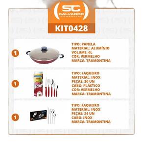 Componentes do kit:- 1 panela wok alumínio 36 cm paris vermelho - tramontina- 1 faqueiro vermelho 30pç - tramontina - 1 faqueiro inox 24pç - tramontinapanela 36cm wok paris aluminio antiaderente tramontina 20545/736descrição ficha técnica:- produzida em alumínio com revestimento interno antiaderente starflon t1- tampa em vidro tamperado com saída de vapor e borda de aço inox.- alças em aço inox com proteção de baquelite antitérmico e pegador de nylon.- modelo wok paris 36cm.- corpo em alumínio reforçado 1,8mm. - revestimento antiaderente starflon.- maior resistência a desgaste por fricção, raspagem.- pode cozinhar fogão a gás, elétrico e também vitrocerâmico.- fácil manuseio e limpeza.- capacidade 6 l.- 1 unidade por embalagem.- pode lavar em máquina.Peso líquido: 1,8 kgpeso bruto: 1,95 kgmedida externa: 15,5cm a x 46,4cm l 36,4cm área cuba .Faqueiro facas talheres ipanema vermelho 30pç tramontina 23398/788descrição ficha técnica:modelo ipanema 30 peças.Cód. 23398/788 cor vermelho.Uso seguro e adequado:- antes da primeira utilização, lave bem as peças e seque-as.- produtos cortantes e perfurantes, tenha cuidado e mantenha sempre fora do alcance das crianças.- para maior durabilidade dos produtos, recomenda-se secar bem antes de guardar, mesmo após lavagem em máquinas.- para descarte dos produtos e embalagem, siga as orientações de reciclagem vigentes.Conteúdo:6 facas lâmina 11,2cm - medida 21cm6 garfos de mesa. - medida 19cm6 colheres de mesa. - medida 19cm6 garfos para sobremesa. - medida 14cm6 colheres para chá. - medida 14cm- lâmina em aço inox, maior resistência a desgaste por fricção, raspagem.- fácil manuseio e limpeza sempre cuidando com navalha e pontas .- 30 pçs por embalagem.Peso líquido: 0,95 kgpeso bruto: 1,05 kgfaqueiro facas talheres buzios 24pç tramontina 23799/071faca e garfo.Descrição ficha técnica:modelo buzios 24 peças.Cód. 23799/071 inox.Uso seguro e adequado:- antes da primeira utilização, lave bem as peças e seque-as.- produtos cortantes e perfurantes, tenha cuidado e mantenha sempre fora de alcance das crianças.- para maior durabilidade dos produtos, recomenda-se secar bem antes de guardar, mesmo após lavagem em máquinas.- para descarte dos produtos e embalagem, siga a orientação de reciclagem vigente.Conteúdo:6 facas churrasco lâmina serrilhada 10,6cm - medida total 20,8cm6 garfos de mesa. - medida total 19cm6 colheres de mesa. - medida total 19cm6 colheres para chá. - medida total 13cm- lâmina em aço inox, maior resistência a desgaste por fricção, raspagem.- fácil manuseio e limpeza sempre cuidando com navalha e pontas .- 24 pç por embalagem.Peso líquido: 0,8 kgpeso bruto: 0,95 kgespecificação da embalagem do kit:peso bruto: 3,95kg medida embalagem: 26cm alt x 45cm l x 38cm p.