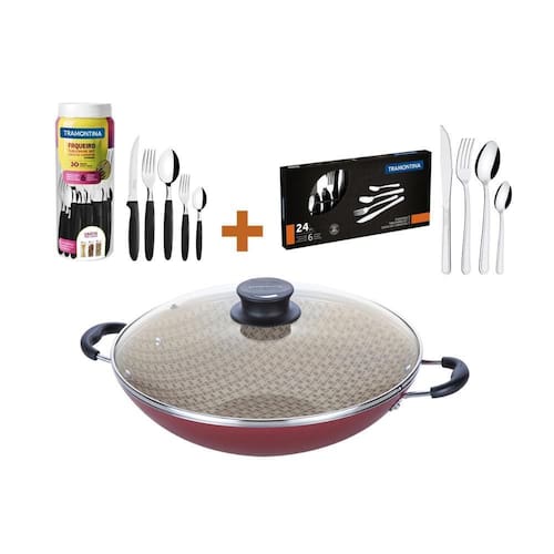 Componentes do kit- 1 panela wok alumínio 36 cm paris vermelho - tramontina- 1 faqueiro 30pç - tramontina- 1 faqueiro inox 24pç - tramontinapanela 36cm wok paris aluminio antiaderente tramontina 20545/736descrição ficha técnica:produzida em alumínio com revestimento interno antiaderente starflon t1tampa em vidro tamperado com saída de vapor e borda de aço inox.Alças em aço inox com proteção de baquelite antitérmico e pegador de nylon.- modelo wok paris 36cm.- corpo em alumínio reforçado 1,8mm.- revestimento antiaderente starflon.- maior resistência a desgaste por fricção, raspagem.- pode cozinhar fogão a gás, elétrico e também vitrocerâmico.- fácil manuseio e limpeza.- capacidade 6 l.- 1 unidade por embalagem.- pode lavar em máquina.Peso líquido: 1,8 kgpeso bruto: 1,95 kgmedida externa: 15,5cm a x 46,4cm l 36,4cm área cuba . - mais detalhes, na foto do anuncio . Faqueiro facas talheres ipanema 30pç tramontina 23398/088faca e garfo.Descrição ficha técnica:modelo ipanema 30 peças.Cód. 23398/088 cor preta.Uso seguro e adequado:- antes da primeira utilização, lave bem as peças e seque-as.- produtos cortantes e perfurantes, tenha cuidado e mantenha sempre fora de alcance das crianças.- para maior durabilidade dos produtos, recomenda-se secar bem antes de guardar, mesmo após lavagem em máquinas.- para descarte dos produtos e embalagem, siga a orientação de reciclagem vigente.Conteúdo:6 facas lâmina 11,2cm - medida 21cm6 garfos de mesa. - medida 19cm6 colheres de mesa. - medida 19cm6 garfos para sobremesa. - medida 14cm6 colheres para chá. - medida 14cm- lâmina em aço inox, maior resistência a desgaste por fricção, raspagem.- fácil manuseio e limpeza sempre cuidando com navalha e pontas .- 30 pç por embalagem.Peso líquido: 0,95 kgpeso bruto: 1,05 kg faqueiro facas talheres buzios 24pç tramontina 23799/071faca e garfo.Descrição ficha técnica:modelo buzios 24 peças.Cód. 23799/071 inox.Uso seguro e adequado:- antes da primeira utilização, lave bem as peças e seque-as.- produtos cortantes e perfurantes, tenha cuidado e mantenha sempre fora de alcance das crianças.- para maior durabilidade dos produtos, recomenda-se secar bem antes de guardar, mesmo após lavagem em máquinas.- para descarte dos produtos e embalagem, siga a orientação de reciclagem vigente.Conteúdo:6 facas churrasco lâmina serrilhada 10,6cm - medida total 20,8cm6 garfos de mesa. - medida total 19cm6 colheres de mesa. - medida total 19cm6 colheres para chá. - medida total 13cm- lâmina em aço inox, maior resistência a desgaste por fricção, raspagem.- fácil manuseio e limpeza sempre cuidando com navalha e pontas .- 24 pç por embalagem.Peso líquido: 0,8 kgpeso bruto: 0,95 kg expecificação da embalagem do kit:peso bruto: 3,95kgmedida embalagem: 26cm alt x 45cm l x 38cm p.