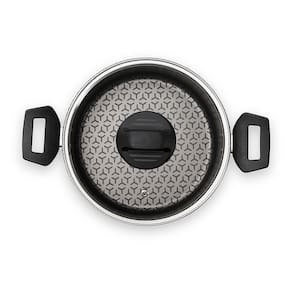Revestimento antiaderente Pro-Flon (PFOA Free) que reduz o uso de óleo, evita que os alimentos grudem e facilita a limpeza. Com alças em baquelite que não esquenta, capacidade de 4,1L e Tampa em vidro com saída de vapor e pomel que não aquece.
