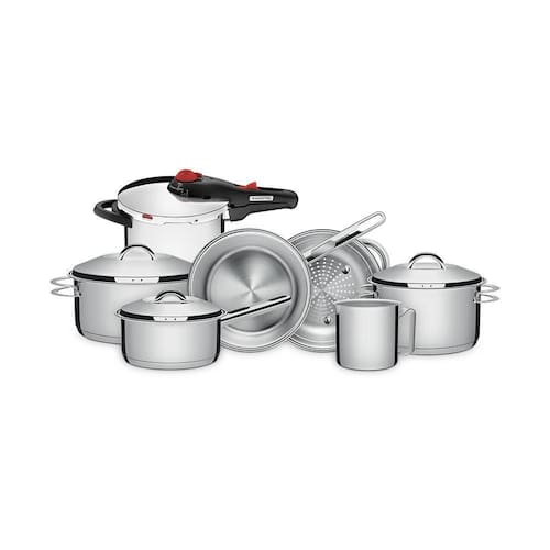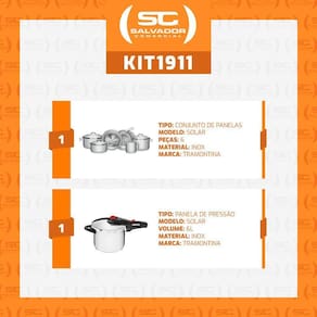 Muito importante:-- conferir produtos no ato do recebimento. Não aceitar produtos com embalagem violada amassado, rasgado, aberto, quebrado, etc , a recusa deve ser feita no ato.Conjunto de panelas solar inox fundo triplo 6 peças e panela de pressão 6l - tramontinacomponentes do kit: - 1 jogo de panelas com fundo triplo corpo e tampa em inox 6 pçs - solar - tramontina cód. 65510200- 1 panela de pressão com fundo triplo em aço inox 22 cm 6 l - solar - tramontina cód. 62516223jogo de panelas com fundo triplo corpo e tampa em inox 6 pçs - solar - tramontina:componentes:1 un - panela 1,4 litro solar11,3cm a x 18cm l x 33,3cm pdiâmetro: 16cmref. 625011601 un - caçarola rasa 4,7l litros solar16,5cm a x 26,3cm l x 33cm pdiâmetro: 24cmref. 625032401 un - caçarola funda 3,6l litros solar16,8cm a x 22,1cm l x 27,5cm pdiâmetro: 20cmref. 625042001 un - cozi-vapore 3,2 litros solar10,5cm a x 22,1cm l x 27,6cm pdiâmetro: 20cmref. 625102001 un - frigideira s/ tampa 2,20 litros allegra8,1cm a x 22,2cm l x 39,6cm pdiâmetro: 20cmref. 626502001 un - fervedor 1,40 litro allegra Não recomenda-se uso em fogão de indução.13,1cm a x 13,1cm l x 17,2cm pdiâmetro: 12cmref. 62664120- fundo triplo: aço inox + alumínio + aço inox - cozimento rápido com distribuição de calor uniforme- as alças de inox aquecem durante o cozimento. Aconselhamos o uso de luvas durante o manuseio.- pode ir ao forno em temperatura máxima de 260c- capacidade volumétrica máxima de cozimento é 3/4 da capacidade total da peçapanela de pressão com fundo triplo em aço inox 22 cm 6 l - solar - tramontina: - pode ser utilizada em fogão a gás, elétrico, vitrocerâmico ou por indução- fundo triplo: aço inox, alumínio, aço inox- distribuição de calor uniforme, cozimento rápido e economia de energia- sistema de descompressão- medidor de capacidade interno- 5 dispositivos de segurança- capacidade mínima: 250ml de líquido 1/4 litro - capacidade máxima: 2/3 da capacidade total da panela alimento + líquido - atestada pela norma nacional de segurança / inmetrocapacidade da panela: 6 litrospressão de trabalho: 80/95 kpapeso líquido: 3,06 kgmedidas do produto: 23,1cm a x 24,7cm l x 45cm p;diâmetro da panela: 22cm.Tamanho da embalagem: 47cm a x 56cm l x 29cm p; peso bruto: 10,3kg.