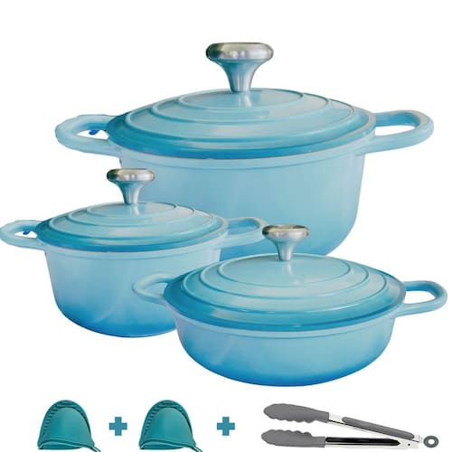 01un Panela com 20cm de diametro e 2,7litros01un Panela com 26cm de diametro e 3,4litros01un Panela com 28cm de diametro e 7,0litros02un Luva de silicone01un Pegador multiuso de silicone e inoxEstas Panelas são diferentes de tudo que voce ja viu, indispensáveis,não solta residuos nada gruda mesmo sem oleo ,é livre de PFOA, mantem o alimento quente por muito tempo e são leves de manusear podendo ser levadas do fogão à mesa de servir.