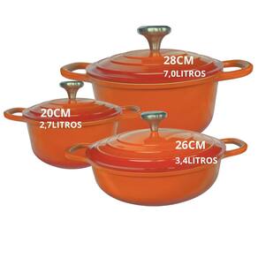 01un Panela com 20cm de diametro e 2,7litros01un Panela com 26cm de diametro e 3,4litros01un Panela com 28cm de diametro e 7,0litros02un Luva de siliconeEstas Panelas são diferentes de tudo que voce ja viu, indispensáveis,não solta residuos nada gruda mesmo sem oleo ,é livre de PFOA, mantem o alimento quente por muito tempo e são leves de manusear podendo ser levadas do fogão à mesa de servir.